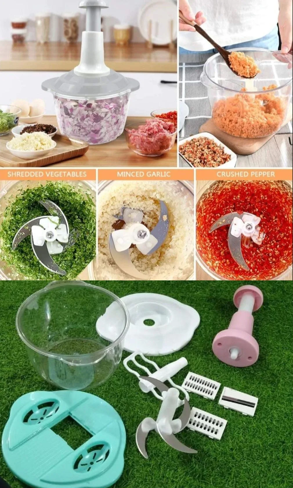 Upgrade your kitchen with the 9 in 1 Multi-Function Food Chopper – a manual vegetable cutter, meat chopper, beater, and slicer in one. With a 2000ML capacity, sharp stainless steel blades, and easy manual push design, it makes cooking fast and effortless. Perfect for chopping veggies, mincing meat, beating eggs, or slicing fruits. Durable, safe, and easy to clean – a must-have kitchen tool!
