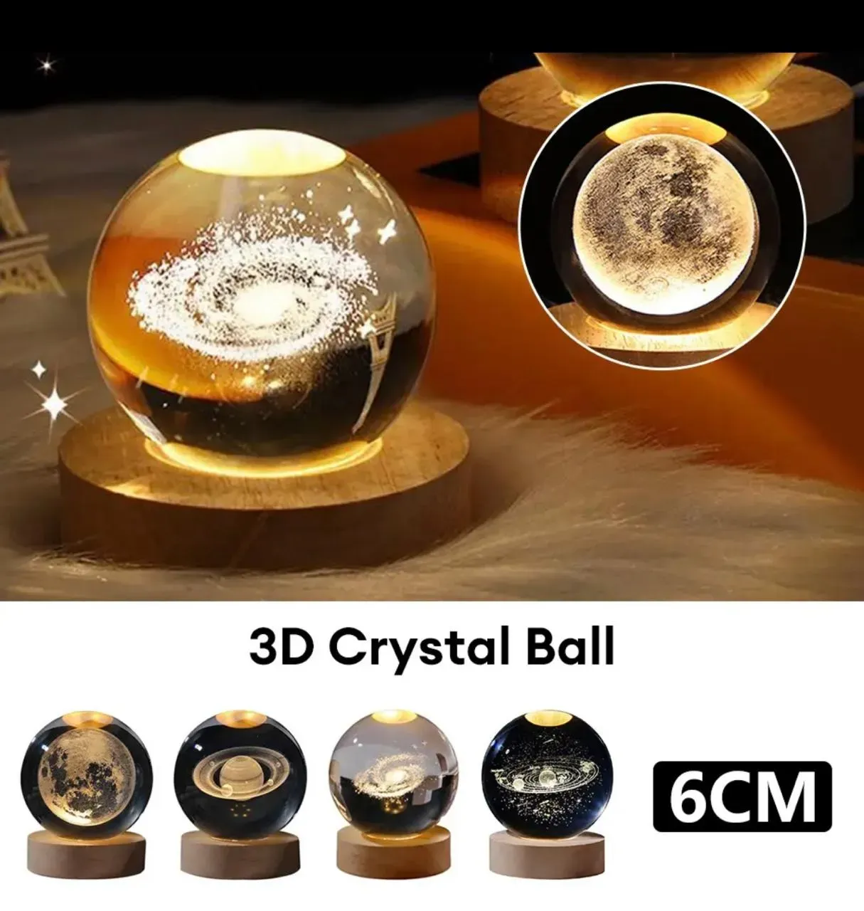 Illuminate your space with the enchanting glow of the 3D Crystal Ball Night Light, available in four breathtaking designs—Moon, Saturn, Milky Way, and Solar System. This creative decorative lamp is perfect for adding a touch of celestial beauty to your home, patio, hotel room, or as a thoughtful gift for your loved ones. With its intricately laser-engraved 3D designs and soft LED lighting, this crystal globe transforms any space into a serene, magical environment.