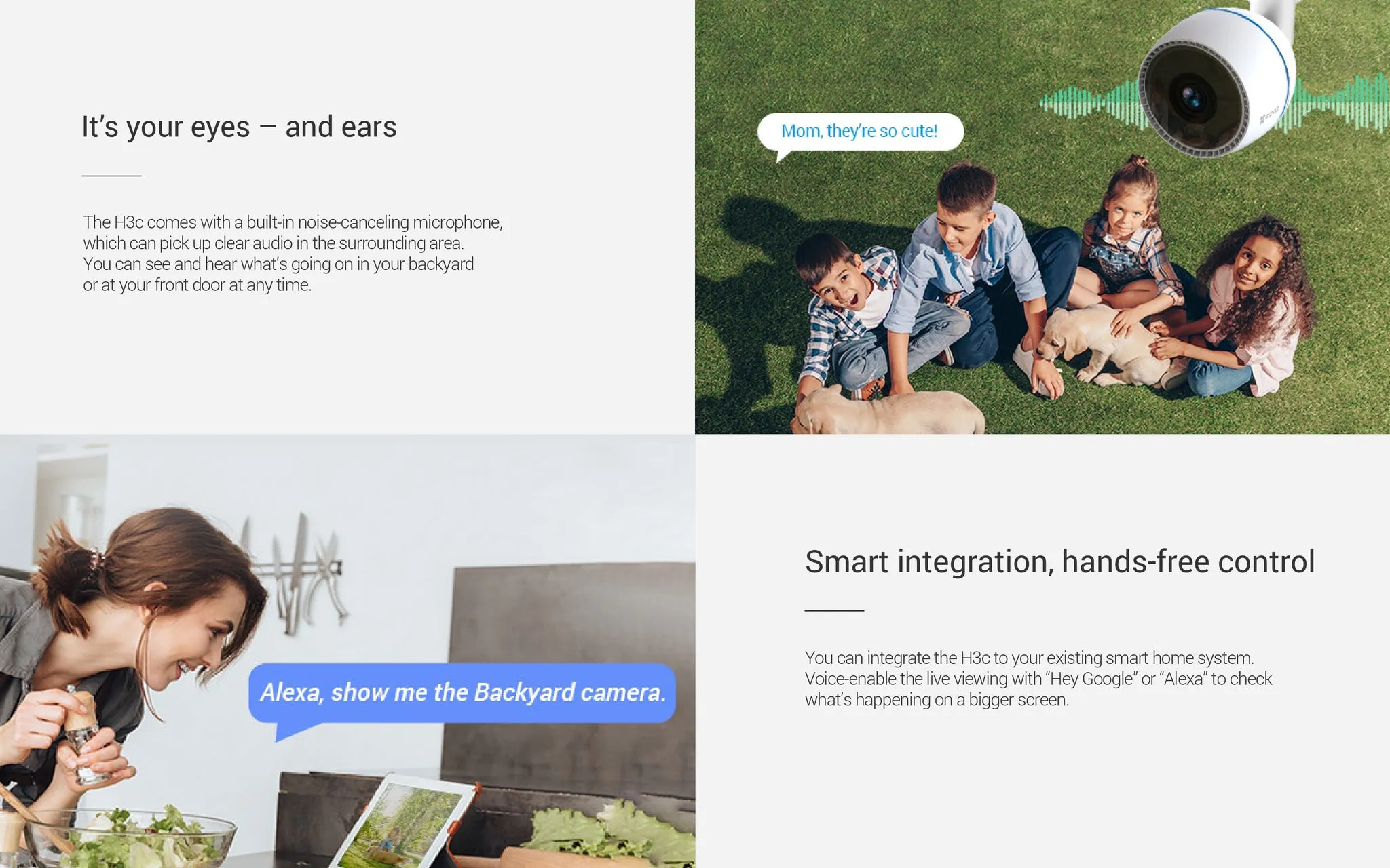 EZVIZ - H3C 1080P by Hikvision is a reliable smart home security camera that delivers crisp Full HD video with clear color night vision up to 15 meters. It uses AI human-shape detection to identify real movement and minimize false alerts. The camera supports customized alert zones, allowing you to focus only on important areas. With IR range up to 30 meters, it ensures sharp footage day and night. Built with H.265 compression, it saves storage while maintaining video quality. Compatible with Google Assistant and Amazon Alexa, it lets you control and view footage hands-free. Supports MicroSD cards up to 512 GB and includes a 2-Year Official EZVIZ Warranty.